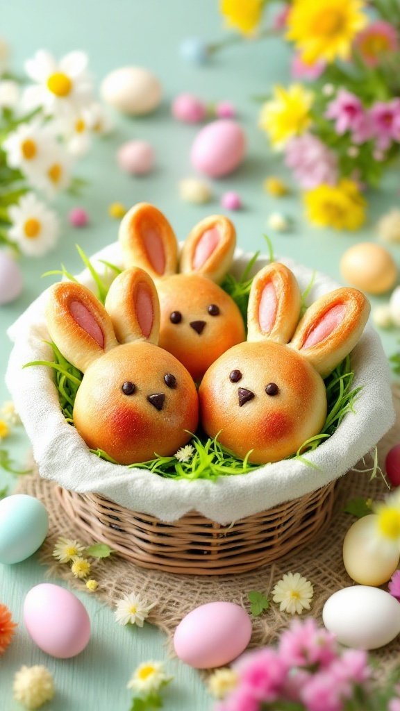 Surrounding the basket with pastel-colored eggs and spring flowers enhances the festive atmosphere, transforming your dining area into a cheerful celebration space. The combination of these elements not only showcases the Bunny Buns but also creates a warm, inviting ambiance that encourages guests to indulge in the seasonal spirit.