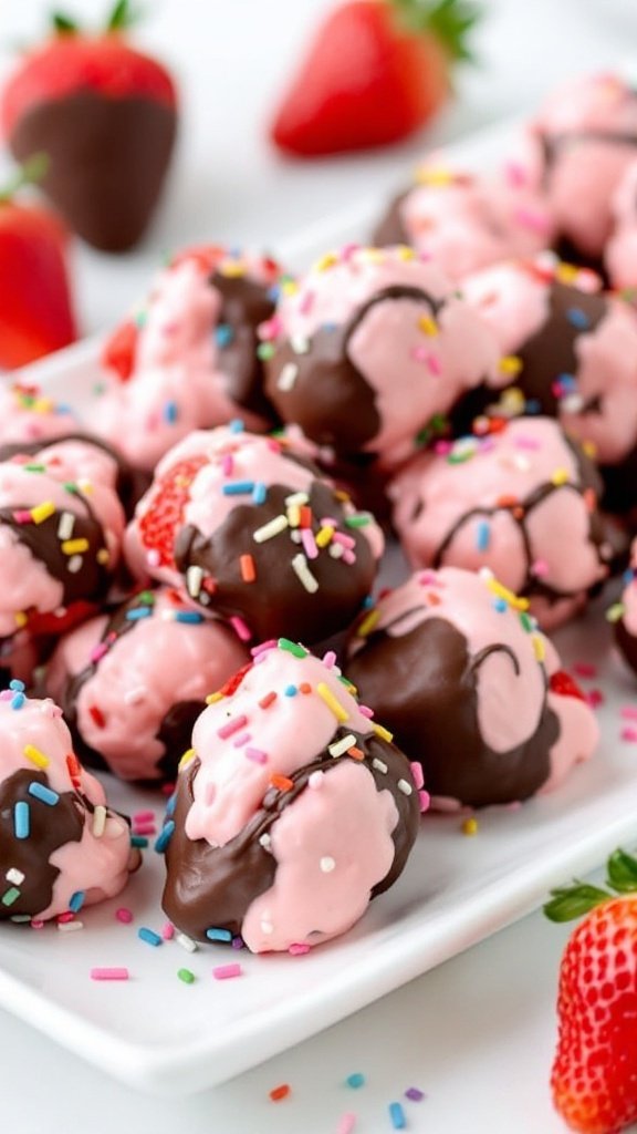 Chocolate-dipped strawberry yogurt clusters are perfect for various occasions, from casual snacks to festive gatherings. They can be served on a white platter, garnished with whole strawberries to create an inviting dessert scene.