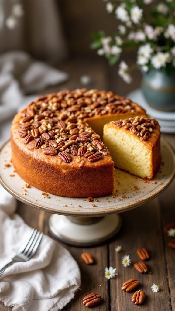 Setting the cake on a rustic wooden table enhances the warm, inviting atmosphere. A few loose pecans scattered around and a delicate floral arrangement can elevate the presentation, making it a centerpiece that sparks conversation and fond memories.