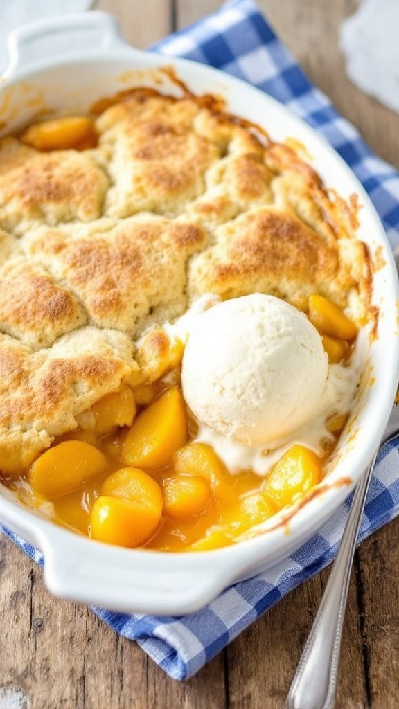Serving this Southern peach cobbler is an experience in itself. A scoop of cold vanilla ice cream melting on the warm cobbler creates a delightful contrast in temperature and texture.