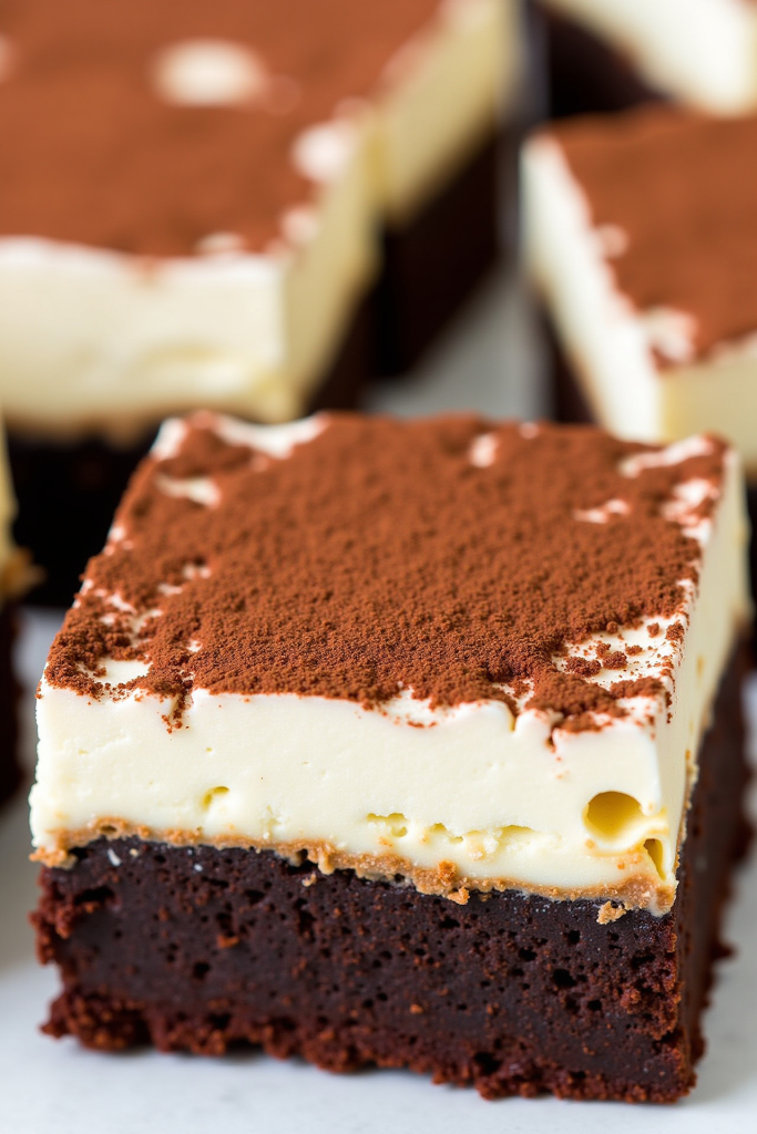 - Prepare Tiramisu Layer: In a separate bowl, beat mascarpone, powdered sugar, espresso, coffee liqueur (or vanilla), and heavy cream until smooth and fluffy. Spread mascarpone mixture evenly over cooled brownies.