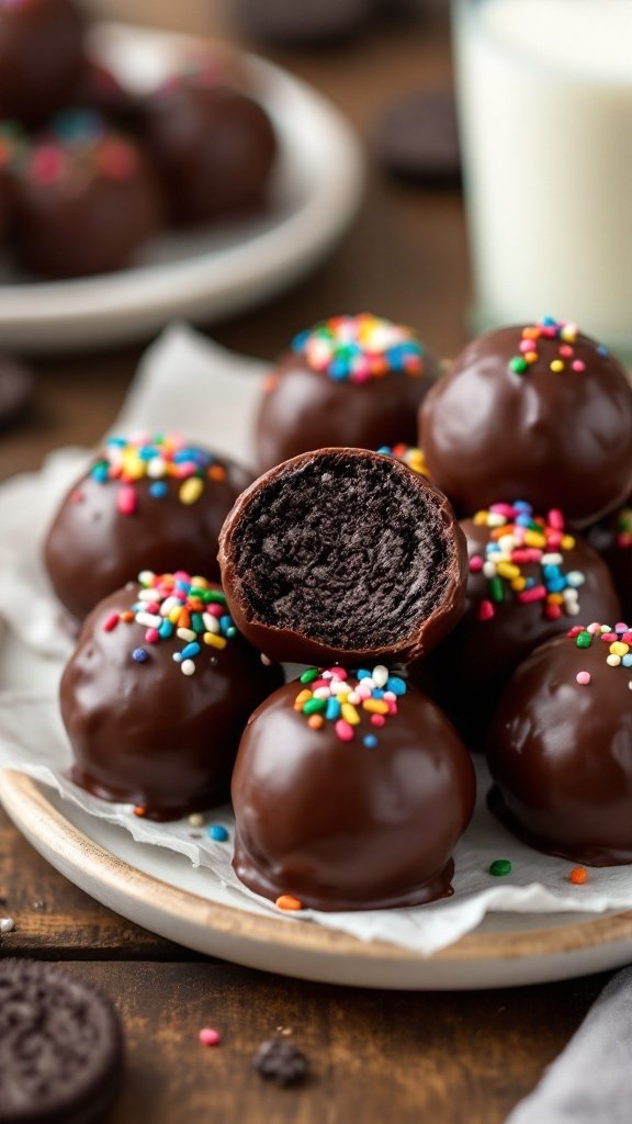 Present these delectable Oreo Balls on a rustic wooden table, paired with a glass of milk, to create an inviting scene for your guests. The combination of the shiny chocolate coating and vibrant sprinkles makes for an eye-catching centerpiece.