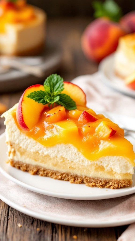 As you slice into the cheesecake, you’ll find that each piece reveals the meticulous layering, inviting everyone to indulge. The blend of creamy sweetness from the cheesecake and the fruity goodness from the peaches creates a memorable treat.