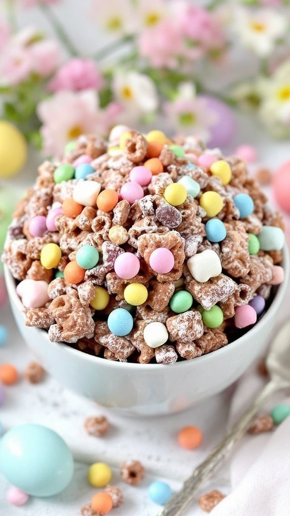 The vibrant bowl of Easter Bunny Chow not only tastes great but also serves as a delightful centerpiece. Surrounded by Easter eggs and spring flowers, it creates an inviting atmosphere that enhances the festive spirit of the occasion. Everyone will love the fun and colorful mix, making it a memorable part of your holiday festivities.