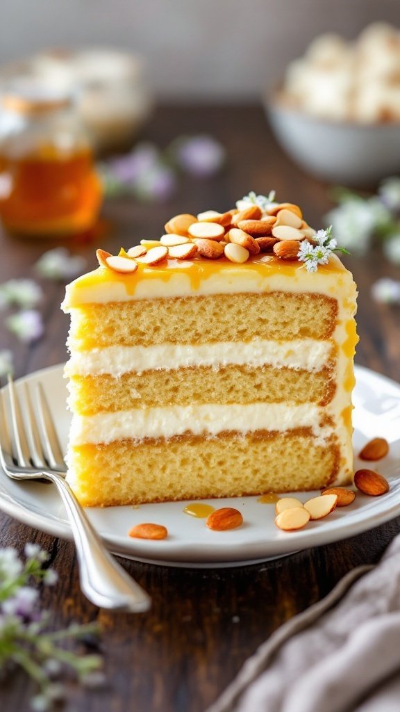 This rich filling adds a creamy texture that contrasts beautifully with the crunchy almond topping. The honey-glazed almonds not only enhance the cake’s visual appeal but also contribute a nutty flavor that brings everything together.
