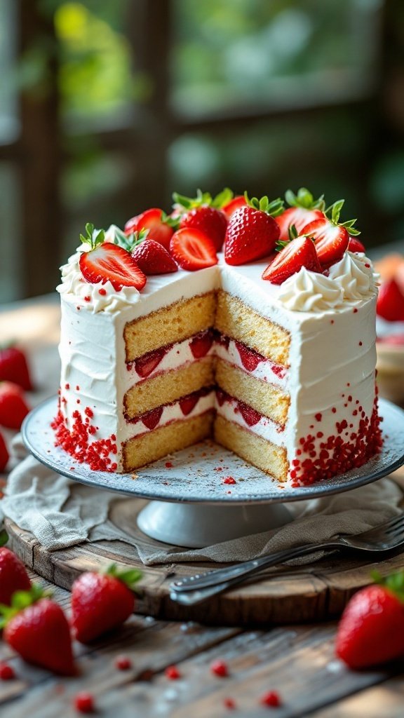 The cake’s construction features a harmonious balance between sweetness and freshness. Each slice reveals moist vanilla layers nestled between luscious whipped cream and juicy strawberries.