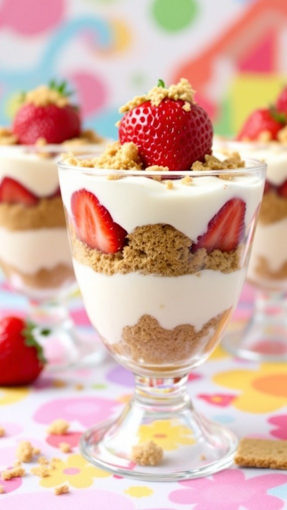 The Strawberry Cheesecake Parfait Cups are stunning to behold, with their vibrant layers of creamy cheesecake and bright red strawberries. These cups not only taste delightful but also serve as a visual centerpiece for any gathering. When placed on a bright tablecloth, the colorful setting enhances the playful aspect of the dessert, making it an inviting choice for children’s parties and events.