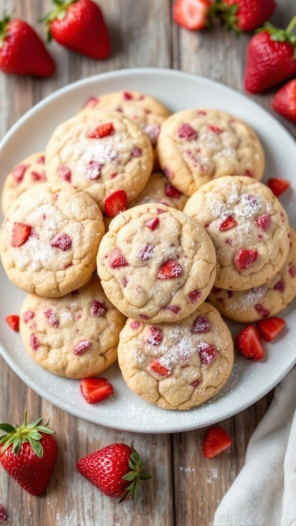 Dusted with powdered sugar, these cookies are as beautiful as they are delicious. A few whole strawberries scattered around enhance the aesthetic, perfect for gatherings or afternoon tea. The rustic wooden table background adds warmth, showcasing the homemade charm of this delightful treat.