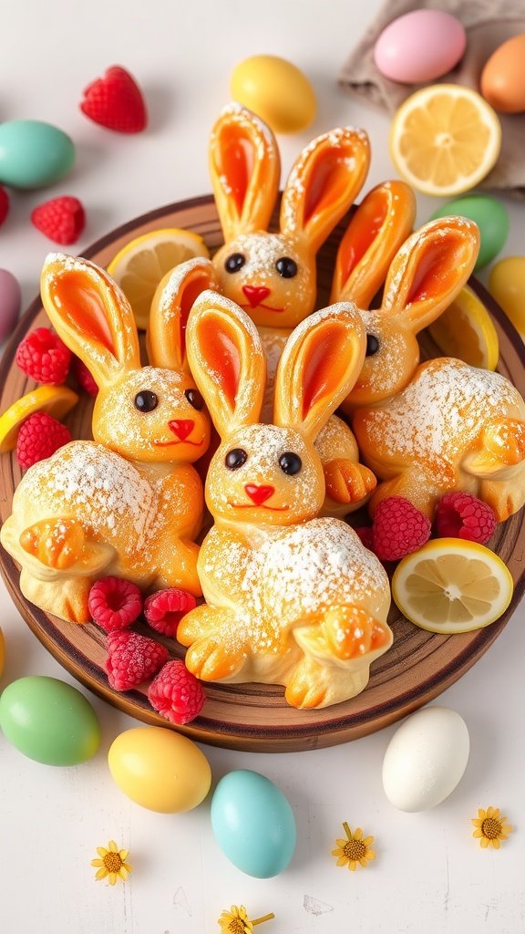 Imagine placing a rustic wooden platter at the center of your table, showcasing these adorable bunny pastries. Surround them with fresh raspberries and lemon slices to enhance the visual appeal.
