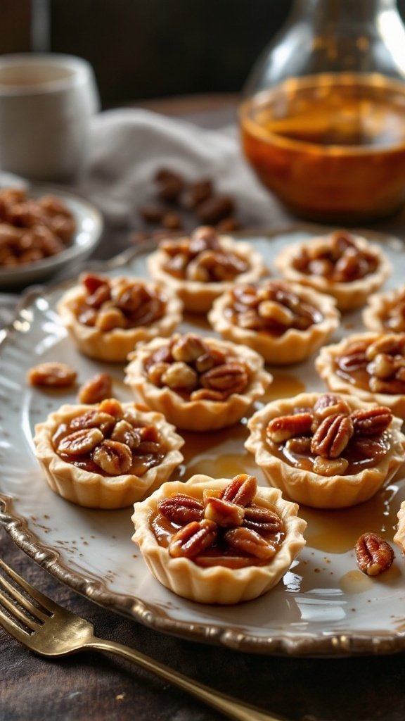 Serve them at room temperature for the best tasting experience. The beautiful presentation of glossy pecan pieces atop the golden-brown tassies adds an inviting touch to any dessert table.