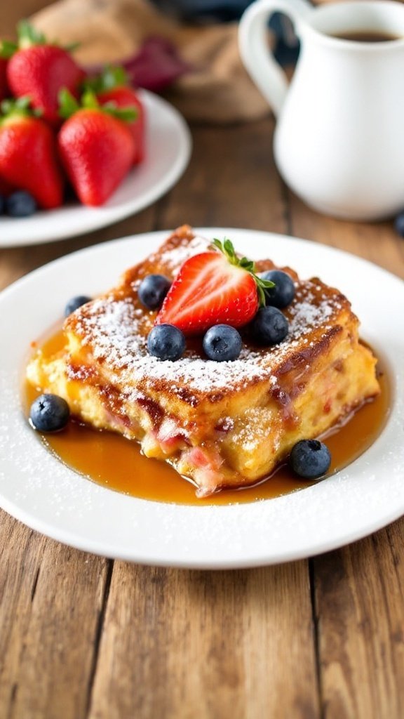 The rustic wooden table enhances the presentation, providing a warm and inviting atmosphere. A beautifully baked Overnight French Toast Casserole, garnished with vibrant berries, looks enticing and inviting. This dish not only satisfies the taste buds but also creates lasting memories around the table.