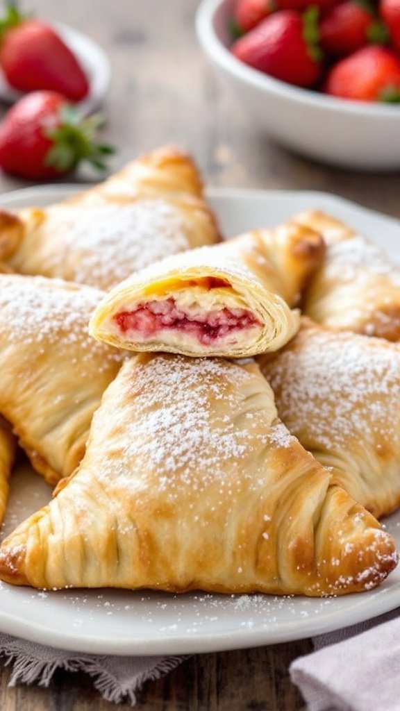 The flaky puff pastry provides a delightful contrast to the smooth, creamy filling. Simply dusting the turnovers with powdered sugar transforms them into a beautiful dessert that captures the essence of summer. Fresh strawberries placed alongside further enhance this inviting presentation.