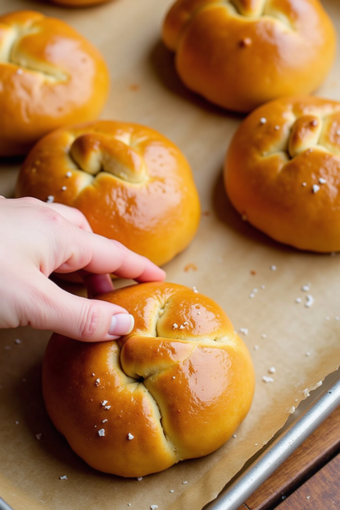 - Meanwhile, preheat your oven to 400°F (200°C). When ready to bake, gently brush the tops of the rolls with melted butter and sprinkle generously with flaky sea salt.