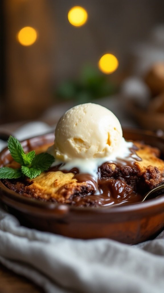 Picture a cozy kitchen setting, soft lighting enhancing the inviting ambiance while you prepare this sumptuous chocolate dessert. The combination of rich chocolate bubbling in a rustic dish, topped with melting vanilla ice cream, creates a picturesque scene.