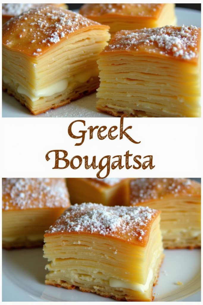 Serve Bougatsa warm, cut into squares or triangles, and scatter generously with powdered sugar and a hint of cinnamon just before serving. For a brunch spread, pair it with strong coffee or Greek yogurt and honey on the side. This pastry is also delicious at room temperature, making it ideal for lunchboxes or sharing at potlucks.