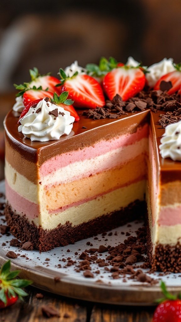 When it’s time to slice and serve, the vibrant layers are sure to impress. Each piece reveals a delightful contrast of chocolate, vanilla, and strawberry, making it a conversation starter among guests. This layered cheesecake pairs wonderfully with a cup of coffee or tea, enhancing the overall experience.