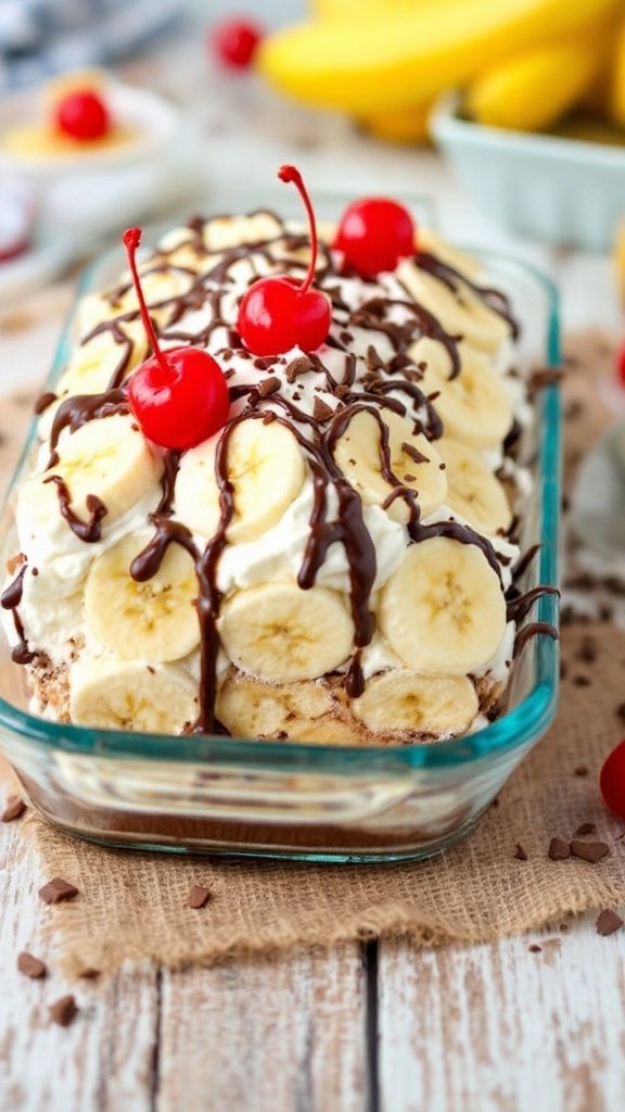 This banana split no bake dessert is a delightful combination of creamy textures and fruity flavors. Each layer is filled with luscious whipped cream, fresh bananas, and a drizzle of rich chocolate syrup, ensuring every bite is an explosion of taste.