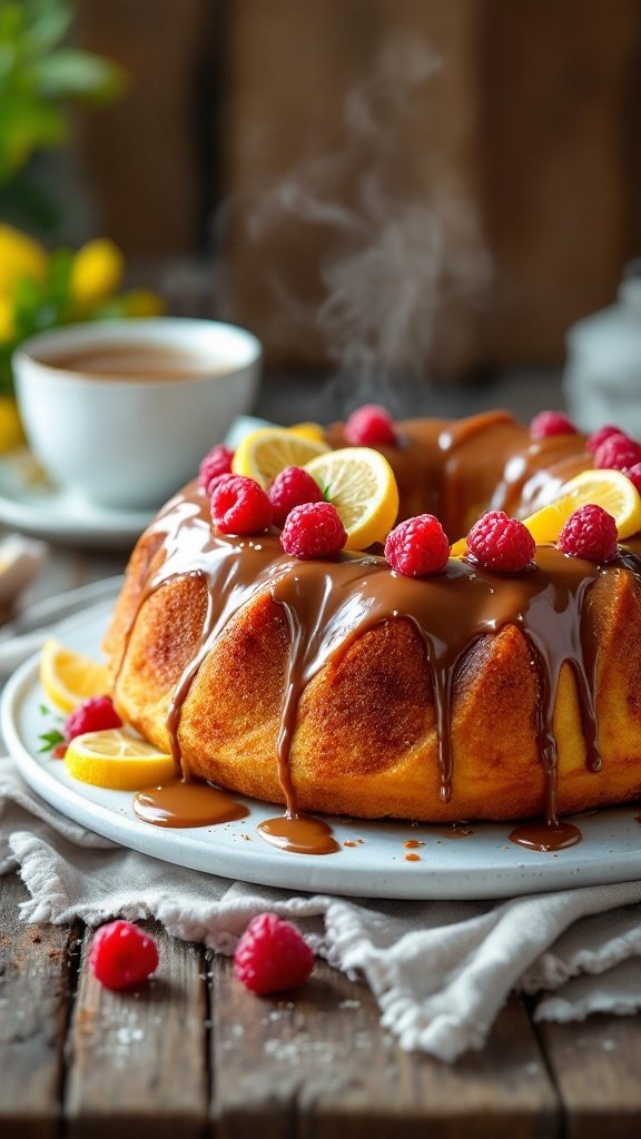 Serve this delightful Lemon Raspberry Bundt Cake drizzled with salted caramel chocolate for a luxurious twist that pairs beautifully with a cup of tea or coffee.