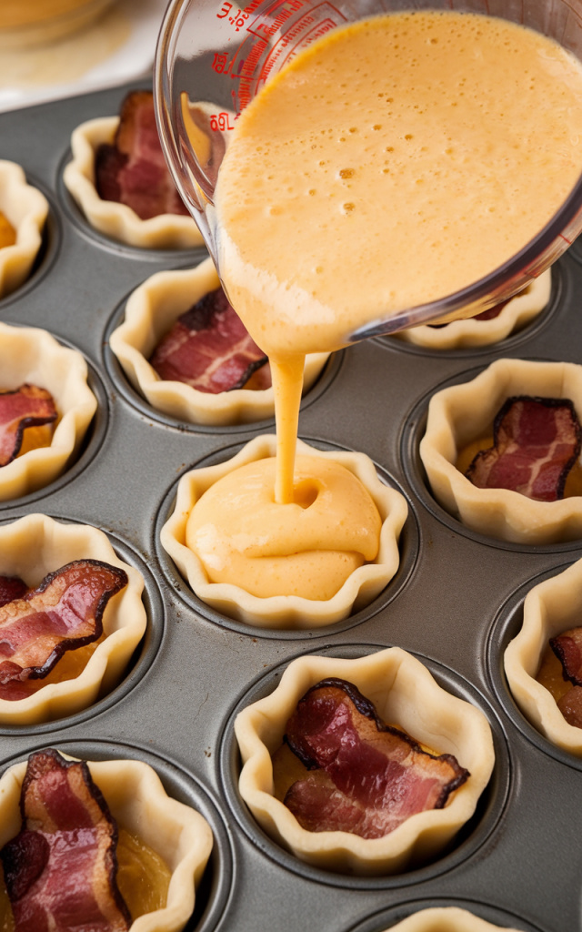 Evenly distribute your favorite mix-ins—like diced bell pepper, spinach, cooked bacon, or shredded cheese—into the pastry cups. For perfectly fluffy eggs, whisk them using a blender, such as the Ninja BL610 Professional 72 Oz Countertop Blender, to ensure a smooth, fully combined egg mixture. Pour this mixture over the fillings in each cup, taking care not to overfill.
