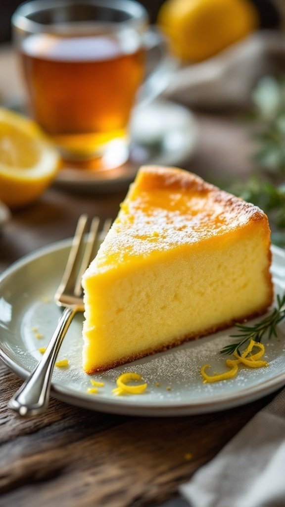 Pairing this Irish Lemon Pudding Cake with a cup of tea takes the experience to another level. The warm ambiance of a rustic wooden table setting enhances the enjoyment, inviting you to savor each moment.