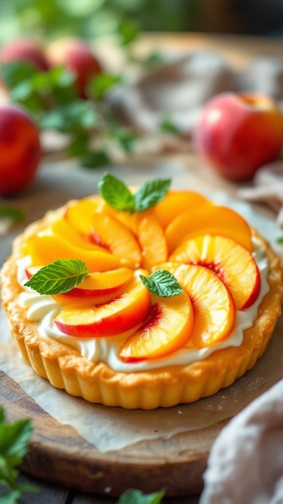 Fresh mint leaves are more than just a garnish; they add a pop of color that enhances the visual appeal of the tart. Their bright green contrasts beautifully with the golden pastry and the soft hues of the peaches.