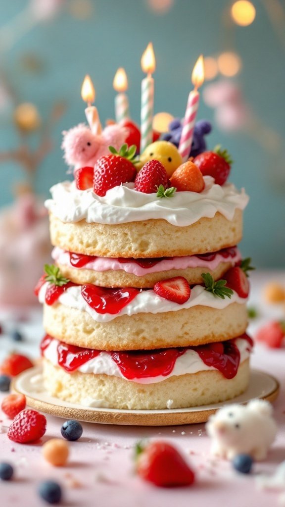 For the filling, a luscious strawberry jam adds a delightful burst of flavor between each cake layer. Its vibrant red hue enhances the cake’s festive appearance, making it a standout centerpiece for any birthday celebration.